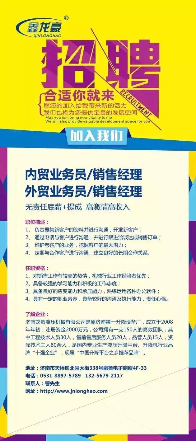 無責(zé)任底薪+提成,每月輕松收入過萬!龍豪液壓,升降機(jī)的廠家,歡迎你的到來!